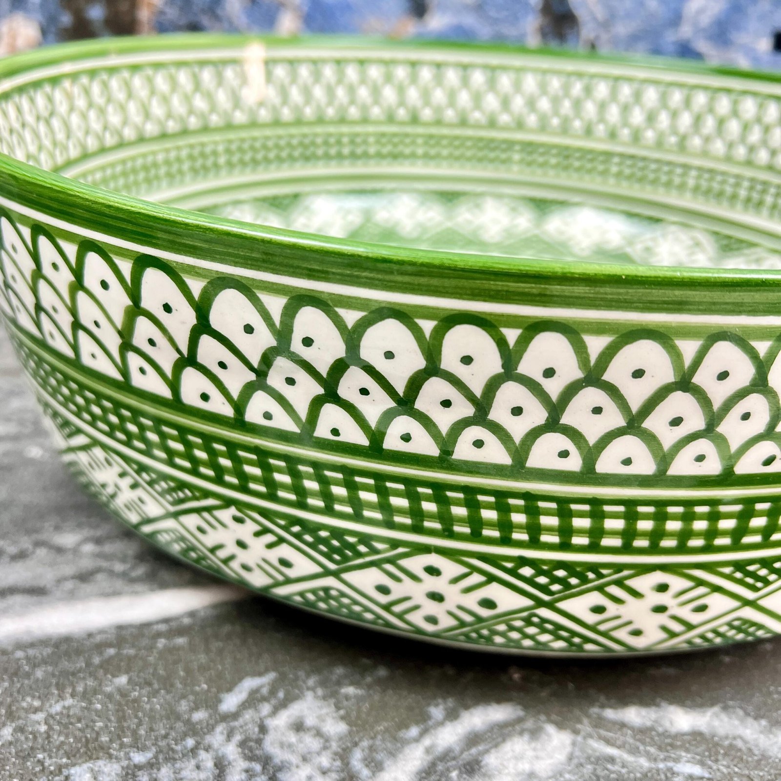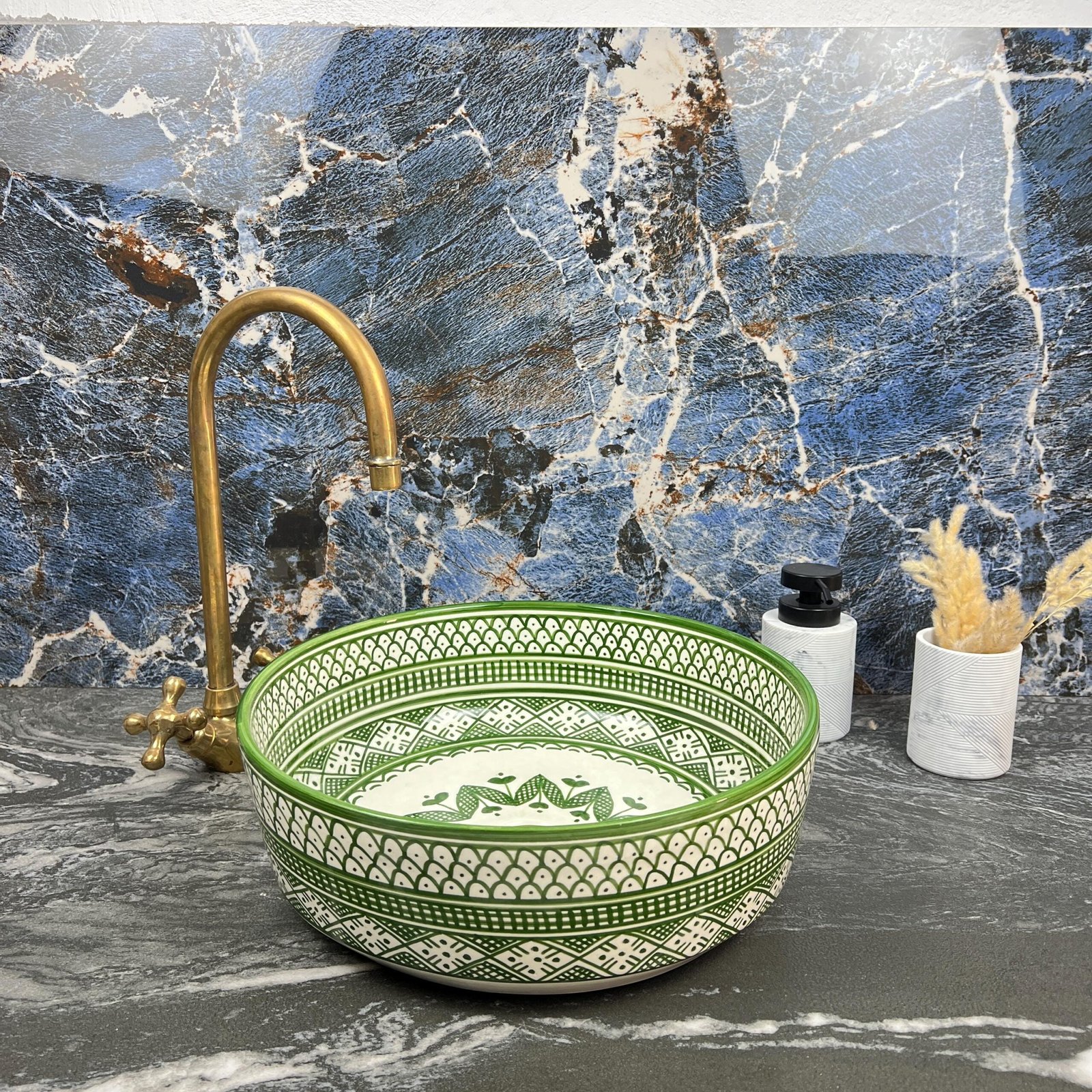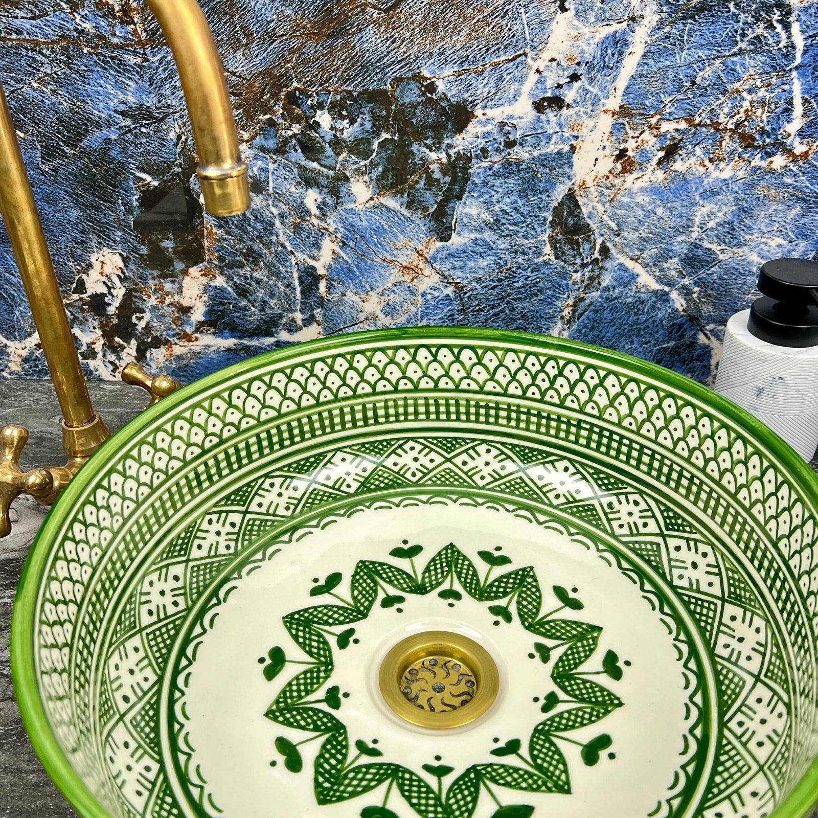 Imagine how morning light dances across the green glaze of the basin, illuminating its shiny paiting with a cozy, welcoming radiance. This handmade centerpiece, tucked away among organic textures and plant embellishments, turns your bathroom into a private haven where everyday routines are transformed into indulgent and peaceful moments.